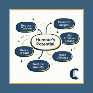 Humour can reduce tension, encourage emotional processing, and strengthen the therapeutic relationship. It helps clients feel understood, supports new perspectives, and can make overwhelming feelings more manageable.